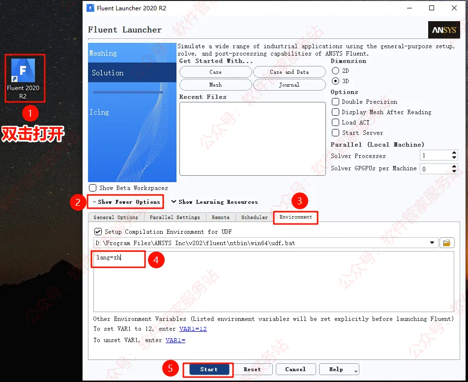 1.双击打开软件;2.选择【show fewer options】;3.点【Environment】;4.输入【lang=zh】;5.点【start】。