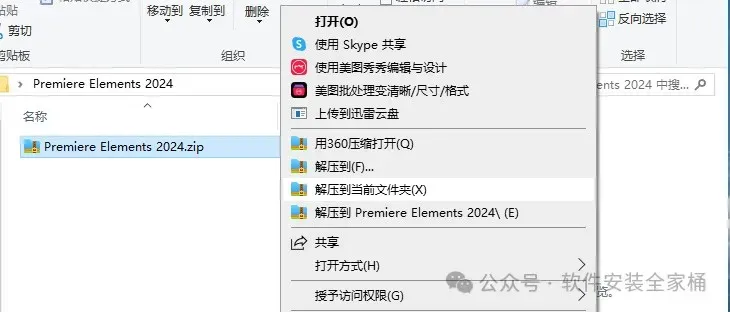 1.打开下载的Premiere Elements 2024软件安装包,鼠标右击压缩包选择【解压到当前文件夹】。