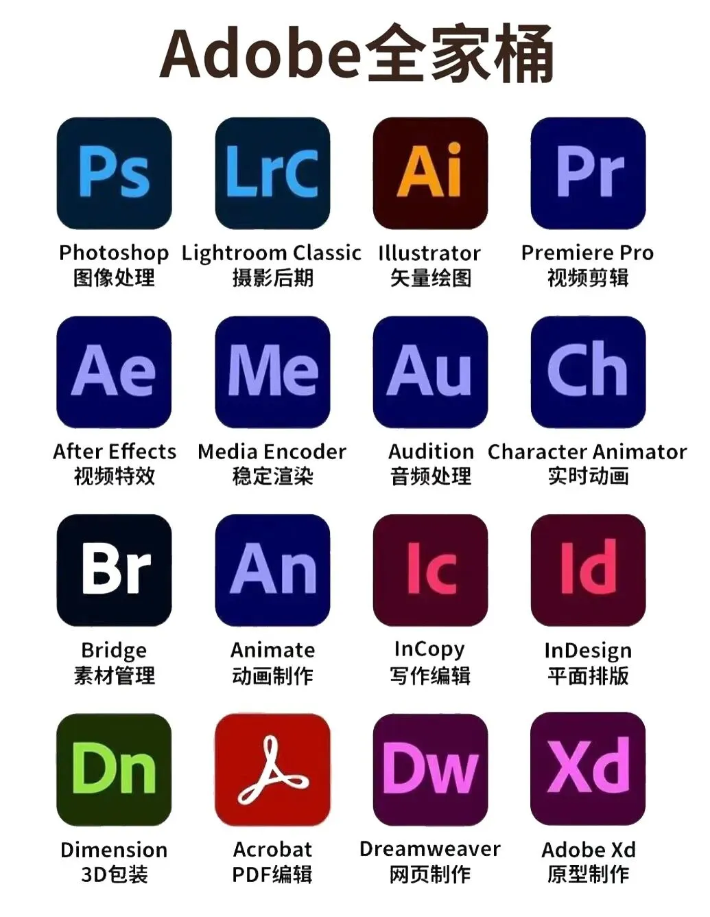Adobe家族软件是创意设计、多媒体处理及数字文档领域的行业标杆,覆盖图像处理、视频剪辑、UI设计、3D建模等多种需求。