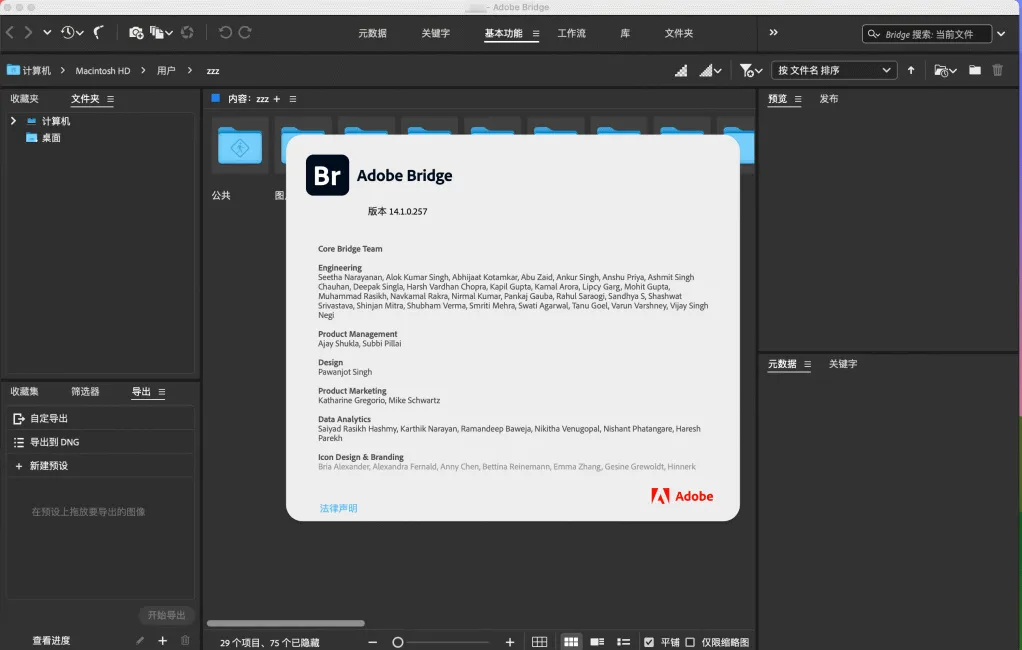 可视化资源管理(支持高清缩略图预览多种文件格式) 批量操作(一键重命名、格式转换、元数据编辑) 跨软件协作(在Photoshop、Camera Raw中编辑) 发布集成(导出至Adobe Stock、生成PDF作品集)