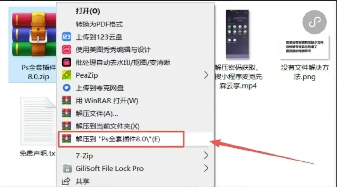 1.打开下载好的文件夹,找到安装包,鼠标右键选择“解压到Ps全套插件8.0.zip\”