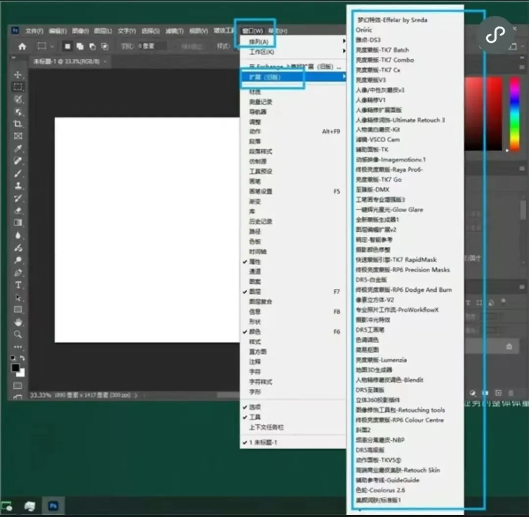 7,然后打开ps软件,点击【窗口】中的【扩展】,就可以看到安装的插件。