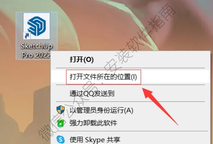 9、返回桌面,选中【SketchUp Pro 2022】图标并点击右键,选择【打开文件所在的位置】