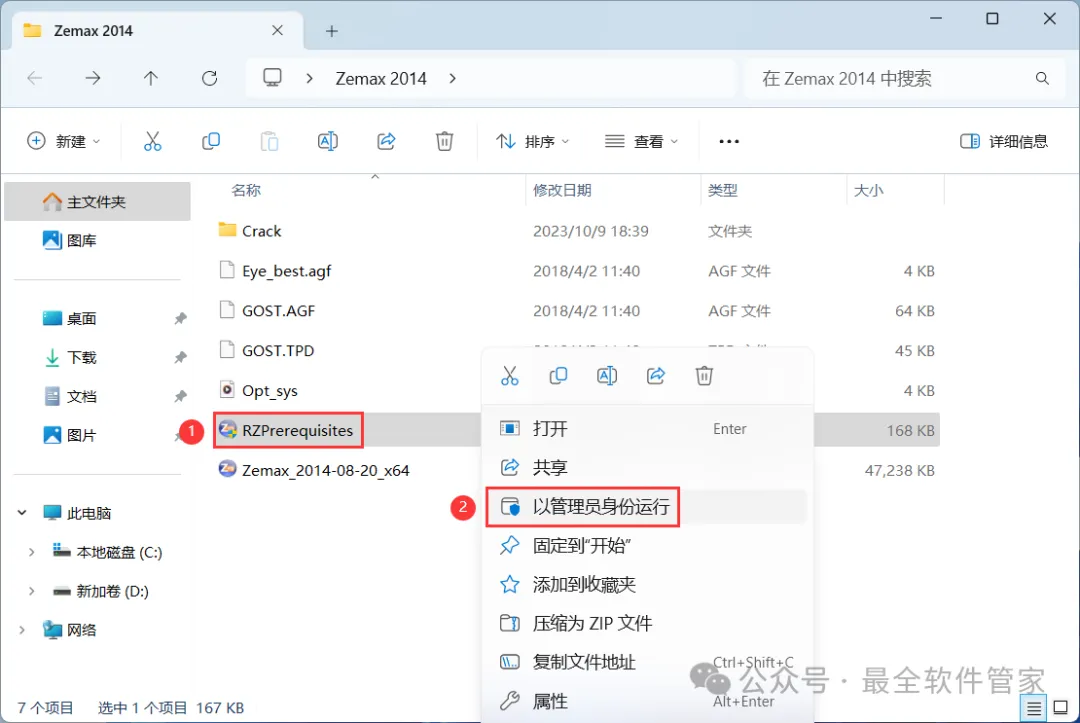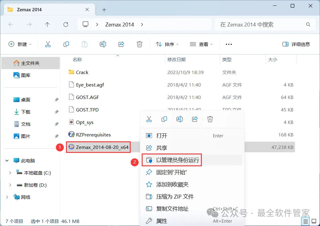16、回到Zemax 2014文件夹,找到【Zemax_2014-08-20_x64】应用程序,右键选择【以管理员身份运行】它