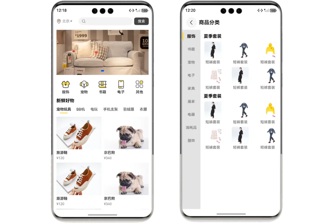 @Local typeList:string[] = ['服饰','书籍','宠物','电子','家具','居家','电器','消耗品','服饰']@Local typeIndex:number = 0@Local typeSubList:TypeClass[] = [{title:'短裤套装',image:$r('app.media.type_1')},{title:'短裤套装',image:$r('app.media.type_2')},{title:'短裤套装',image:$r('app.media.type_3')},{title:'短裤套装',image:$r('app.media.type_4')},{title:'短裤套装',image:$r('app.media.type_1')},{title:'短裤套装',image:$r('app.media.type_2')},]@Builder GroupTitle(title:string){Text(title).fontColor(Color.Black).fontSize(17).fontWeight(FontWeight.Bold).padding({left:13,top:15,bottom:10})}build() {NavDestination(){Flex({direction:FlexDirection.Row}){List(){ForEach(this.typeList,(item:string,index)=>{ListItem(){Stack({alignContent:Alignment.Start}){if(this.typeIndex == index){Row(){}.width(5).height(30).borderRadius(2.5).backgroundColor('#FADA52')}Row(){Text(item).fontColor(this.typeIndex == index?Color.Black:'#666666').fontSize(this.typeIndex == index?16:14).fontWeight(this.typeIndex == index?FontWeight.Bold:FontWeight.Regular)}.alignItems(VerticalAlign.Center).justifyContent(FlexAlign.Center).height(50).width('100%').onClick(()=>{this.typeIndex = index})}}})}.width(86).height('100%').backgroundColor('#e3e3e3')List(){ListItemGroup({header:this.GroupTitle('夏季套装')}){ListItem(){Grid(){ForEach(this.typeSubList,(item:TypeClass,index)=>{GridItem(){Column({space:6}){Image(item.image).width(65).height(65)Text(item.title).fontColor('#666666').fontSize(14)}}})}.width('100%').columnsTemplate('1fr 1fr 1fr').rowsGap(10).columnsGap(10)}}ListItemGroup({header:this.GroupTitle('夏季套装')}){ListItem(){Grid(){ForEach(this.typeSubList,(item:TypeClass,index)=>{GridItem(){Column({space:6}){Image(item.image).width(65).height(65)Text(item.title).fontColor('#666666').fontSize(14)}}})}.width('100%').columnsTemplate('1fr 1fr 1fr').rowsGap(10).columnsGap(10)}}}.height('100%').width('100%')}.width('100%').height('100%')}.title('商品分类')}