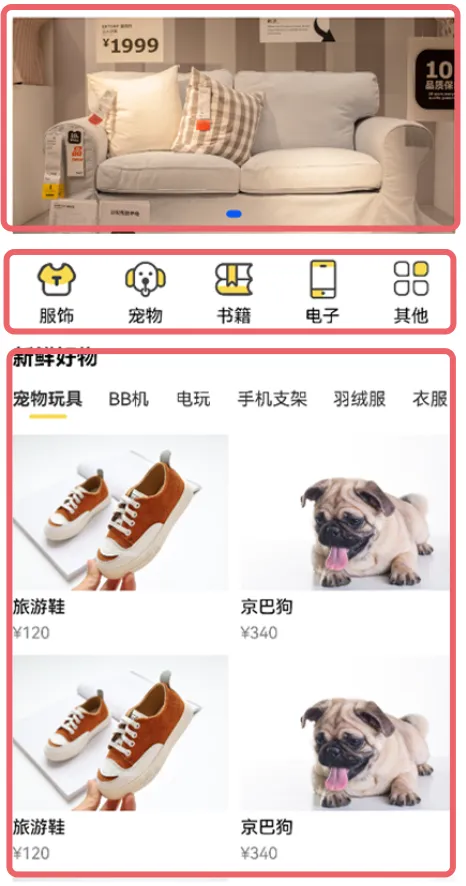 @Local goods:GoodsClass[] = [{name:'旅游鞋',price:'120',image:$r('app.media.goods1')},{name:'京巴狗',price:'340',image:$r('app.media.goods2')},{name:'旅游鞋',price:'120',image:$r('app.media.goods1')},{name:'京巴狗',price:'340',image:$r('app.media.goods2')},{name:'旅游鞋',price:'120',image:$r('app.media.goods1')},{name:'京巴狗',price:'340',image:$r('app.media.goods2')}]ListItem(){Grid(){ForEach(this.goods,(item:GoodsClass,index)=>{GridItem(){Column(){Image(item.image).width('100%').height(124)Text(item.name).fontColor(Color.Black).fontSize(14).margin({top:5})Text('¥' + item.price).fontColor(Color.Gray).fontSize(13).margin({top:5})}.alignItems(HorizontalAlign.Start)}})}.columnsTemplate('1fr 1fr').rowsGap(10).columnsGap(10).maxCount(2).margin({top:13})}