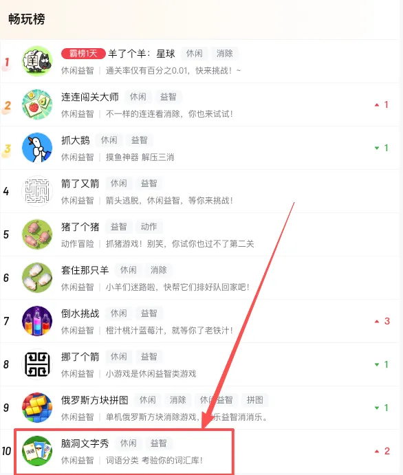 这款游戏的原型是脑洞文字秀,该游戏在微信人气榜和畅玩榜双双在榜。数据表现不言而喻,已经是大热门类型了,众多模仿者都在路上了。