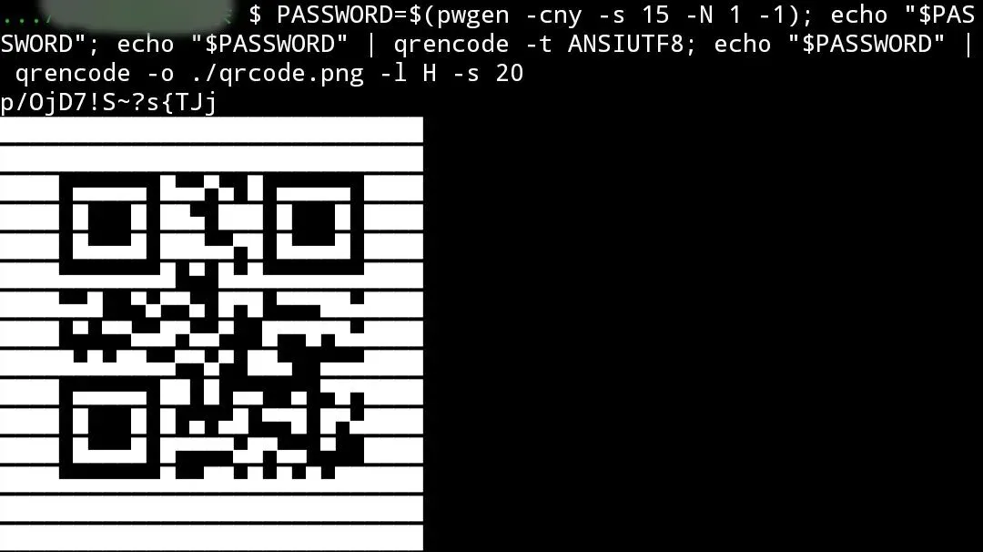 PASSWORD=$(pwgen -cny -s 15 -N 1 -1); echo "$PASSWORD"; echo "$PASSWORD" | qrencode -t ANSIUTF8; echo "$PASSWORD" | qrencode -o ./qrcode.png -l H -s 20