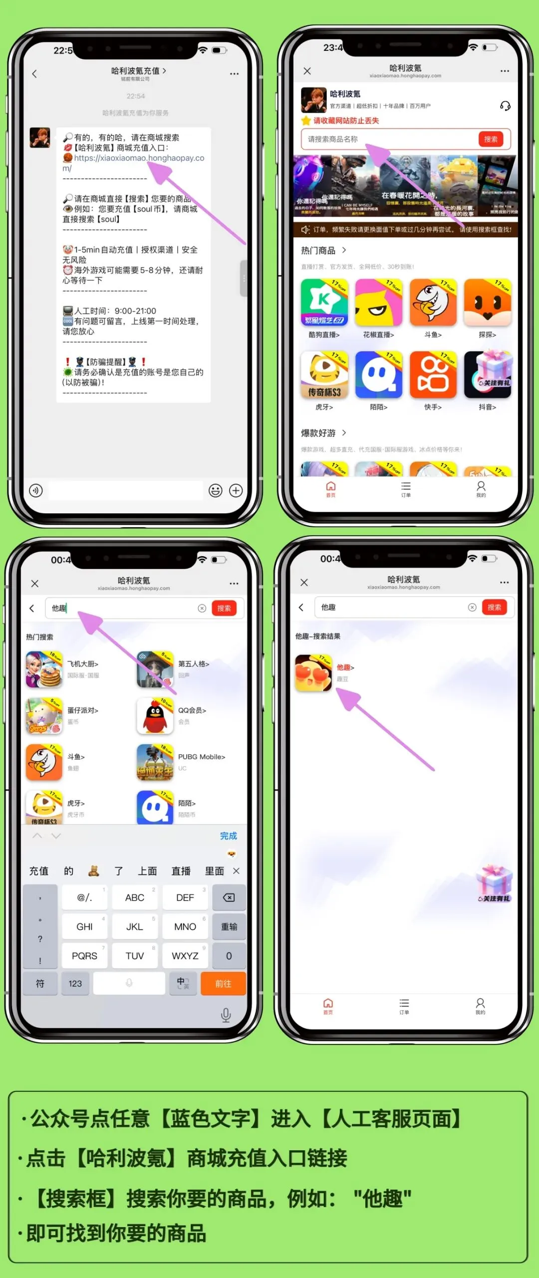 图例说明:点击客服对话框【哈利波氪】商城充值入口链接丨在商城中搜索【他趣】