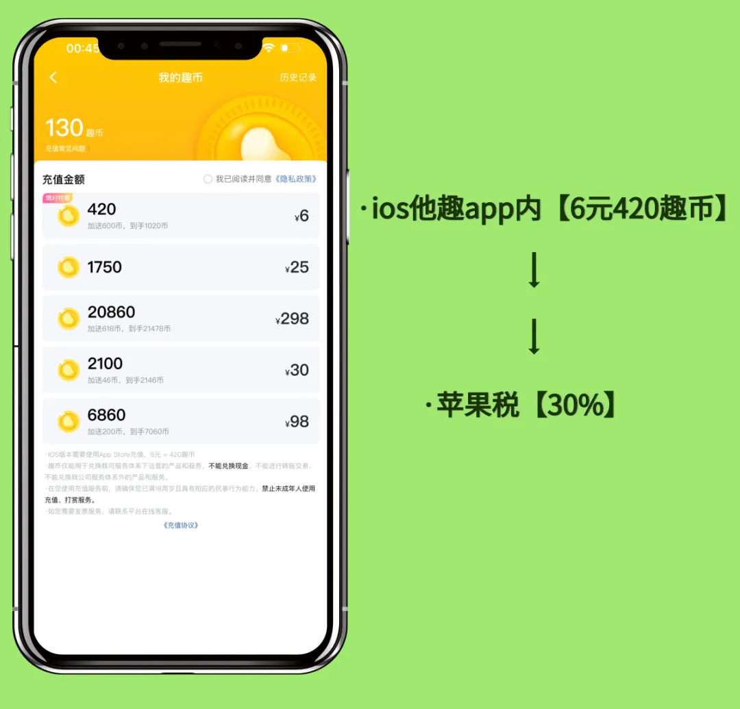 ①.他趣币充值原本是6元600趣币,ios内是6元420趣币,这就是ios内收取30%苹果税的原因