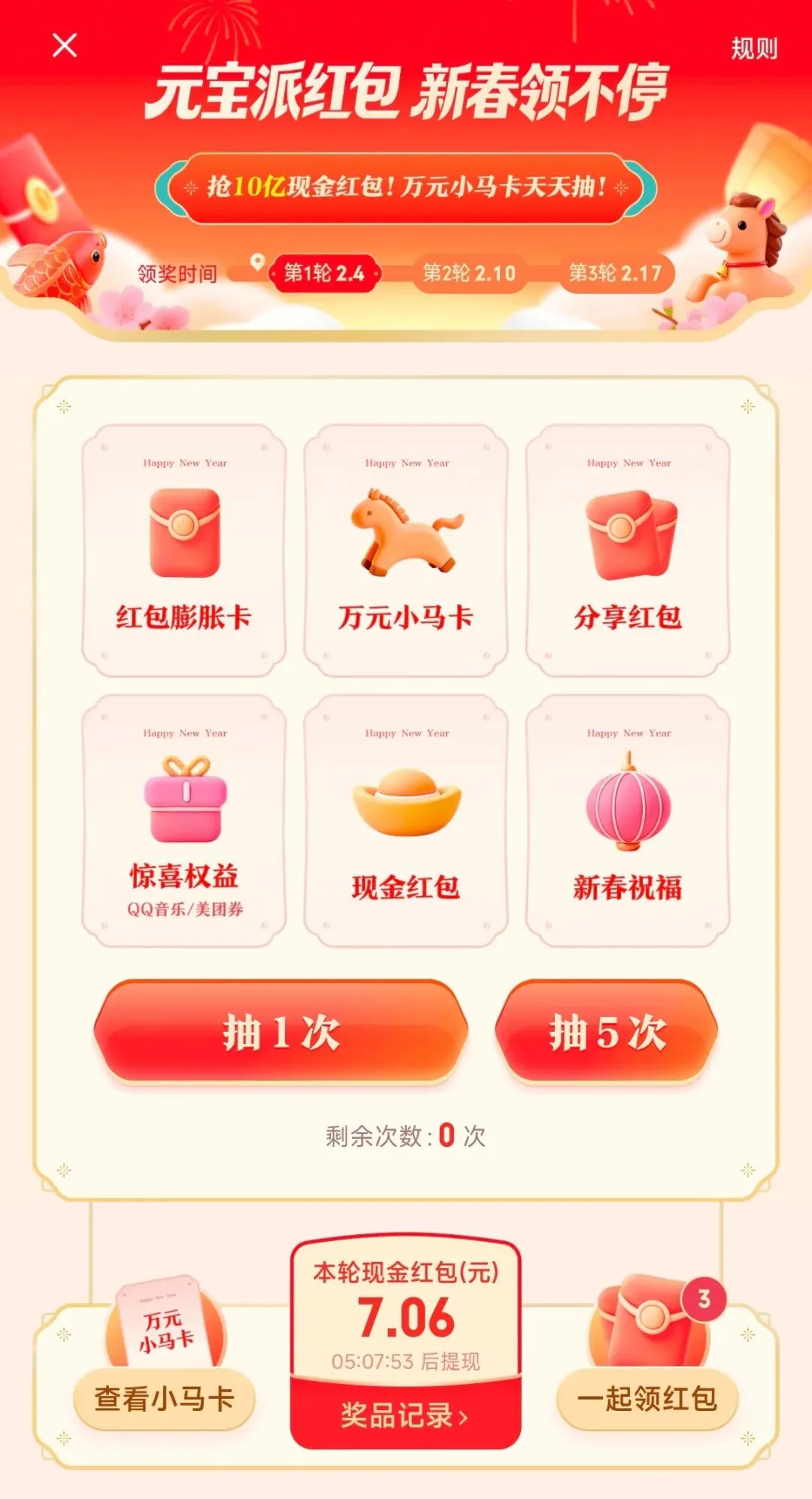 万元小马卡:抽中后统一在 2月17 日当天提现,不参与膨胀。