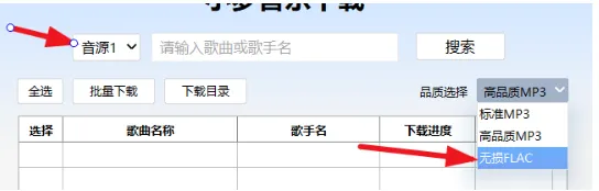 在搜索栏输入歌名(歌手名),如果无法搜索,可切换音源,然后右侧品质可以选择无损