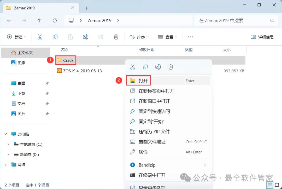 14、回到Zemax 2019文件夹,找到【Crack】文件夹,右键【打开】它