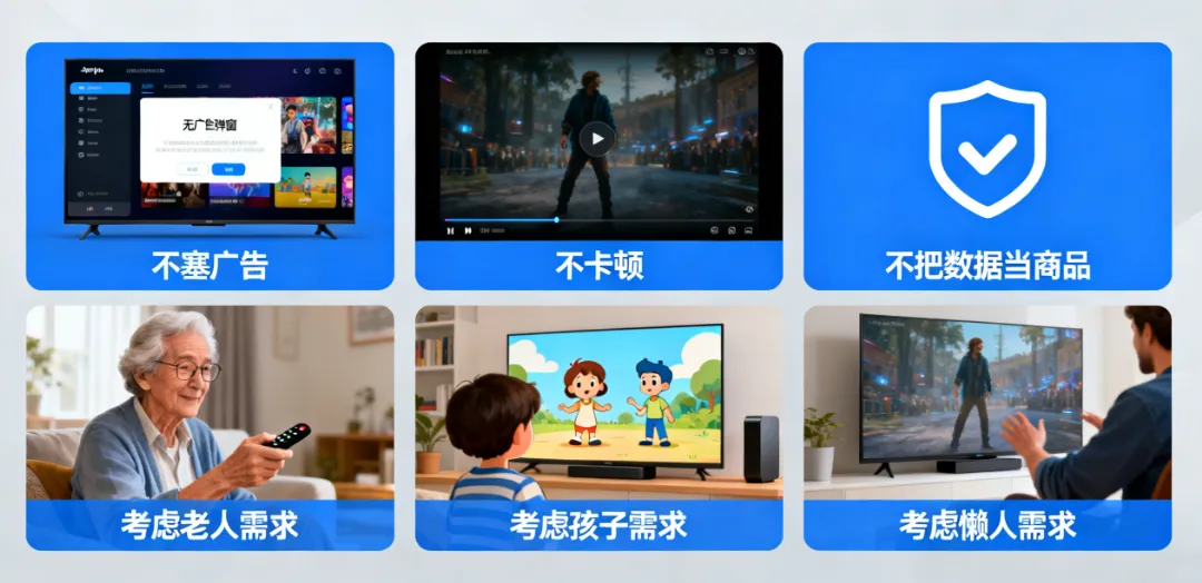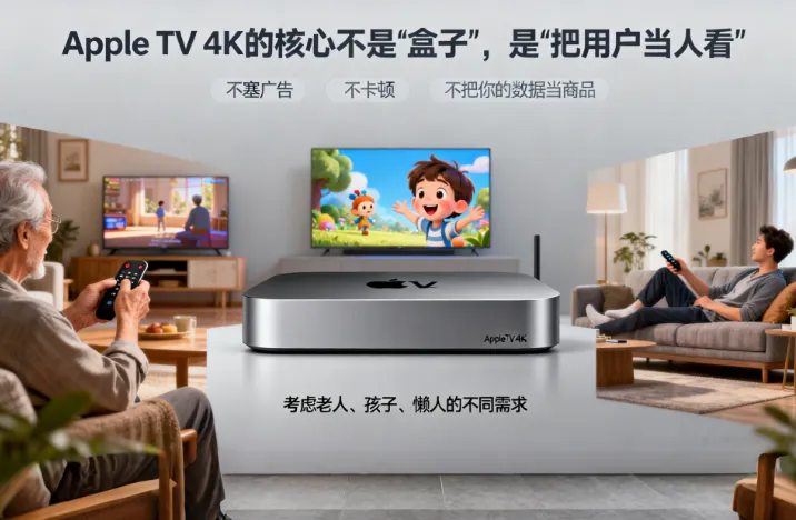 「讲了这么多案例,你发现没?Apple TV 4K的核心不是「盒子」,是「把用户当人看」——不塞广告、不卡顿、不把你的数据当商品,甚至考虑到老人、孩子、懒人的不同需求。