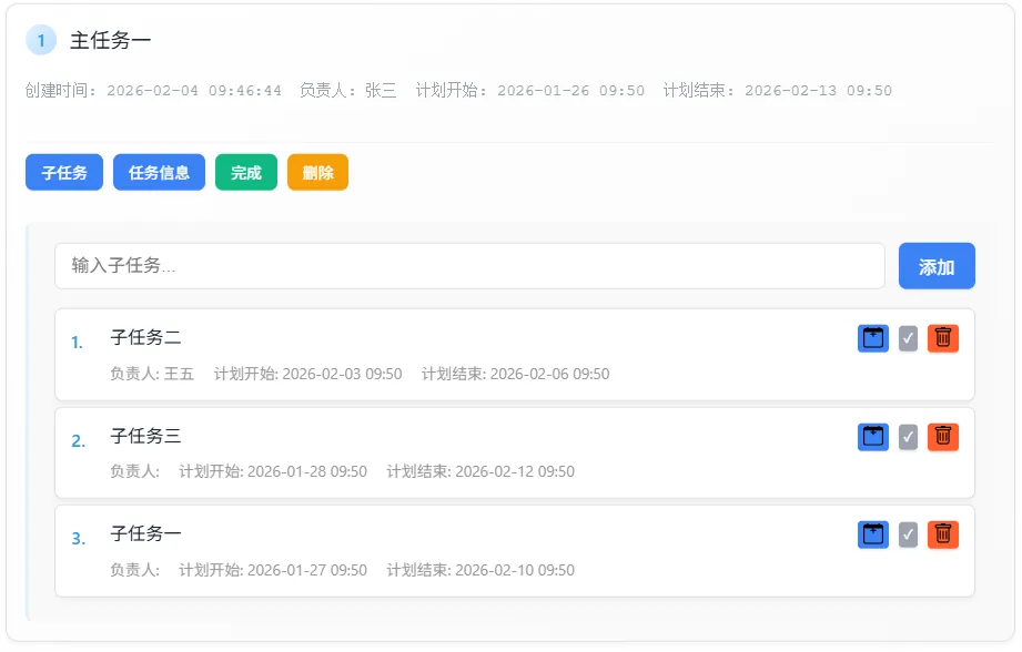 Q:主任务完成时间会跟随子任务变化吗?A:当然!子任务完成时间超过主任务后,主任务完成时间会自动更新。
