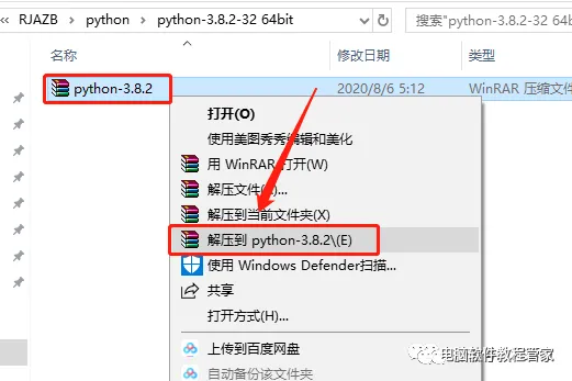 1.下载软件安装包,鼠标右击【python-3.8.2】压缩包,选择【解压到python-3.8.2】。