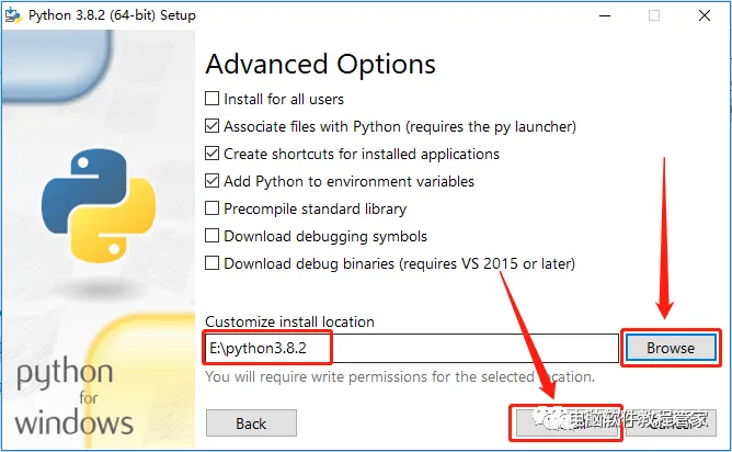 7.点击【browse】设置软件的安装路径,建议在E盘或其他磁盘新建一个【Python3.8.2】文件夹,设置好安装路径后点击【Install】。