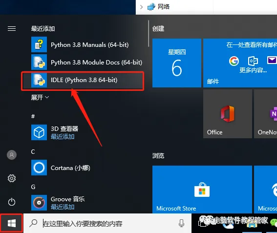 13.开始菜单栏找到并打开【IDLE (Python 3.8 64-bit)】。