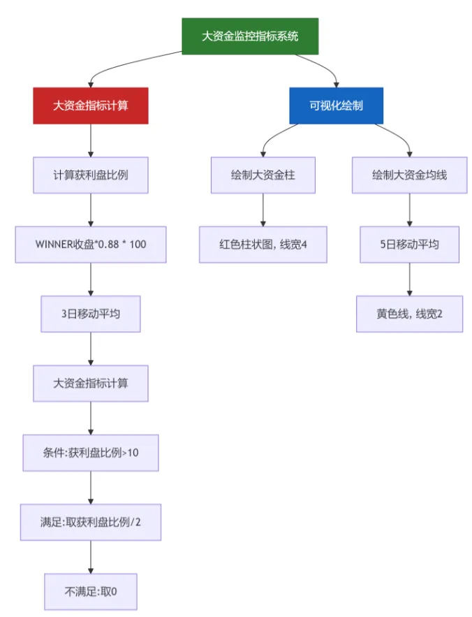 {通过计算获利盘比例,监测大资金动向,并绘制资金柱状图和均线}