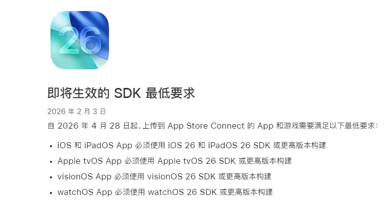 苹果正式通知:上架AppStore必须使用 iOS 26 SDK!