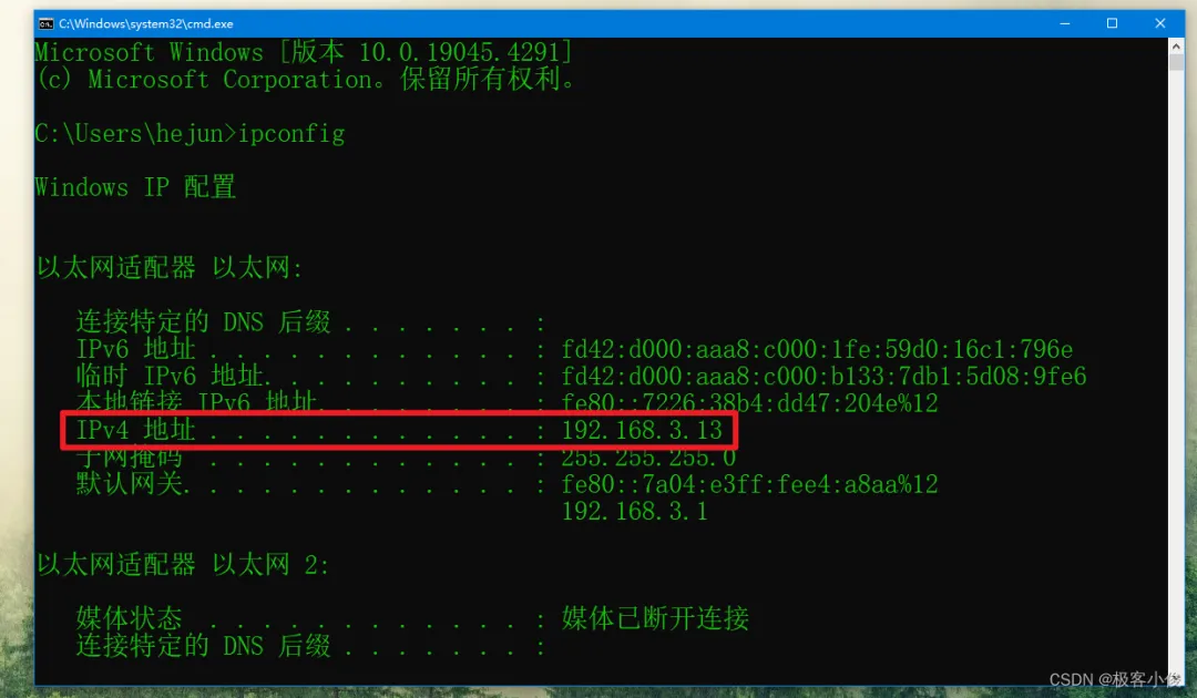 然后根据你自己的电脑网络环境查看到本机的IP地址, 你也可以从cmd命令行中使用ipconfig命令去查看自己电脑局域网的IP地址!