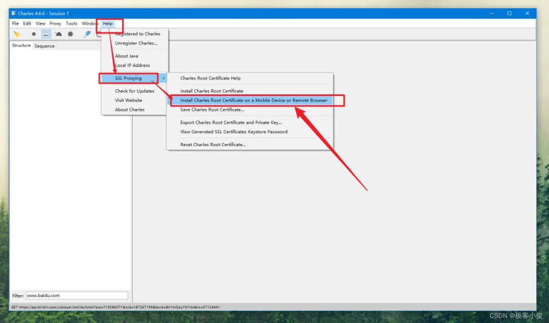 首先打开Charles 选择菜单栏上的 Help-->SSL Proxying-->Install Charles Root Certificate on a Mobile Device or Remote Browser在移动设备或远程浏览器上安装Charles Root证书