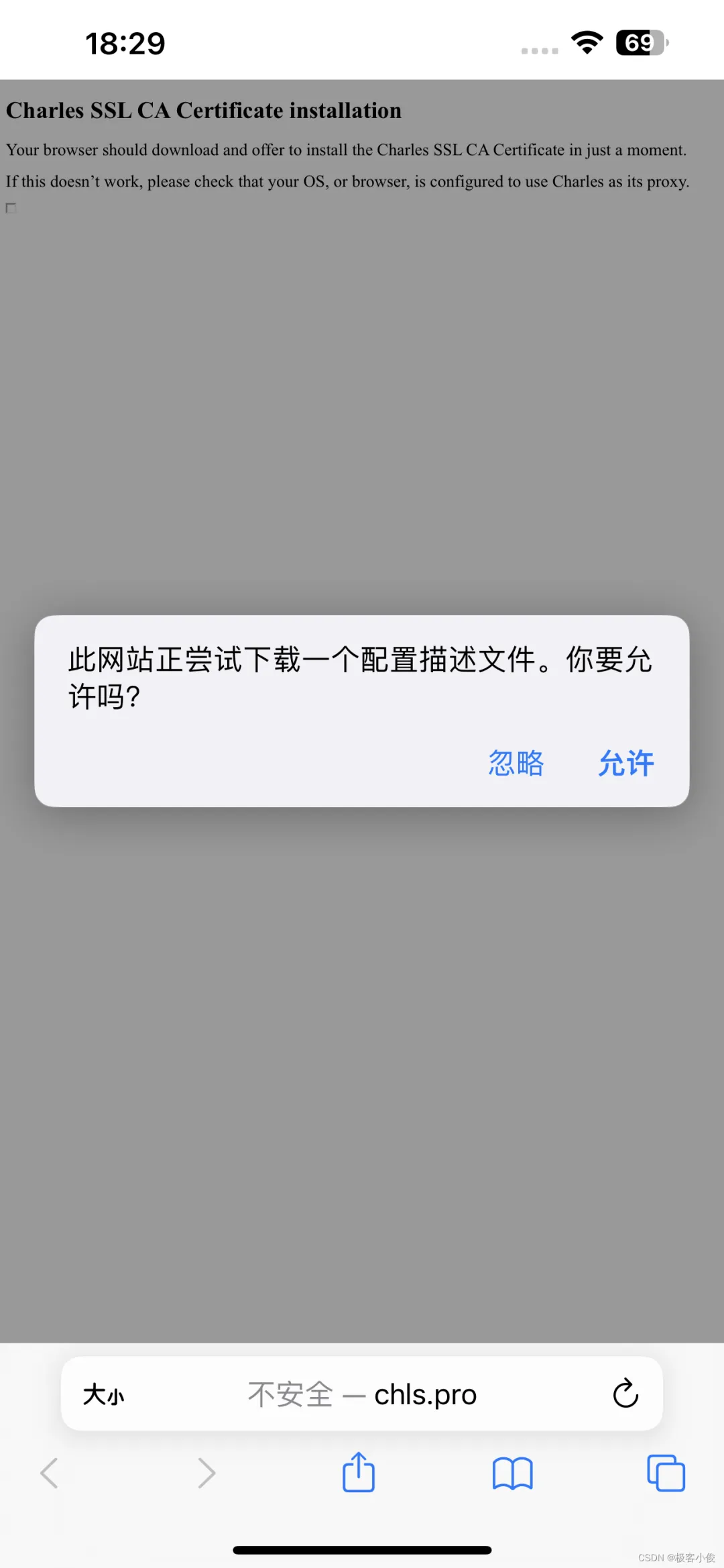 那么接下来我们就可以到iOS手机端打开Safari浏览器输入地址为https://chls.pro/ssl去下载并安装证书!