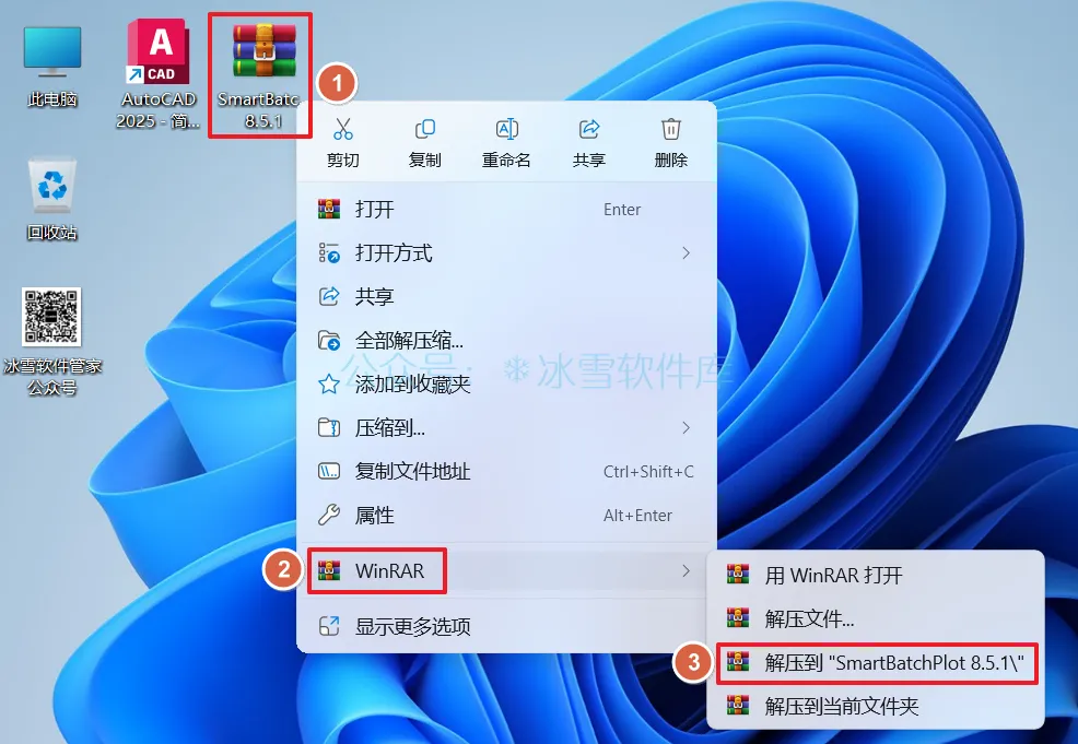 1.解压安装包:①鼠标右击【SmartBatchPlot 8.5.1】压缩包②选择电脑上安装的解压软件(如:WinRAR压缩)③点击【解压到 SmartBatchPlot 8.5.1】。
