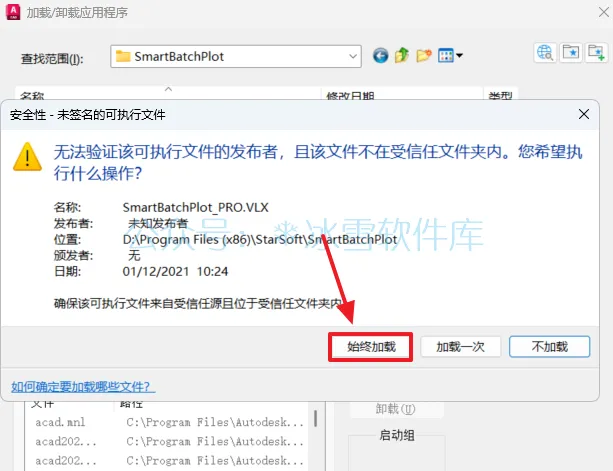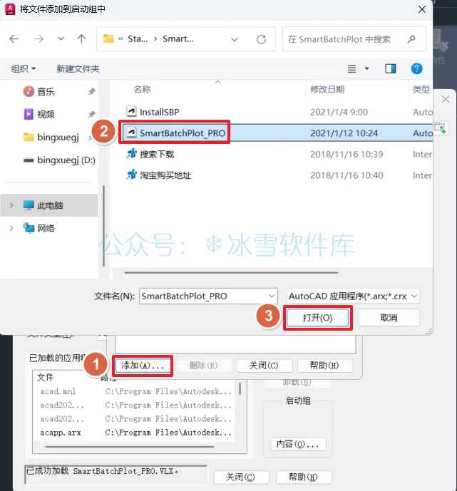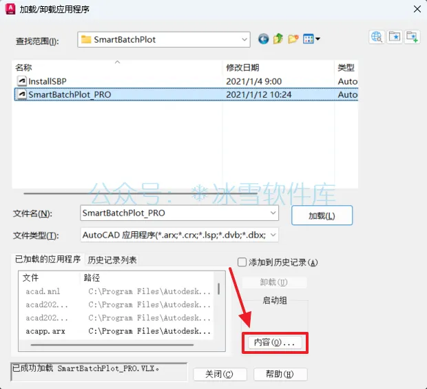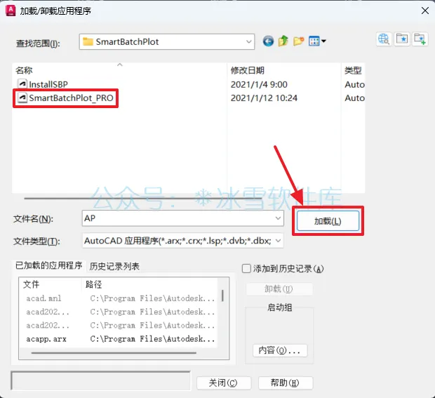 10.打开步骤5的文件安装位置并选中【SmartBatchPlot PRO】,点击【加载】。