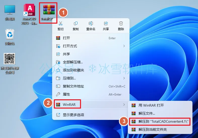 1.解压安装包:①鼠标右击【TotalCADConverter4.1】压缩包②选择电脑上安装的解压软件(如:WinRAR压缩)③点击【解压到 TotalCADConverter4.1】。
