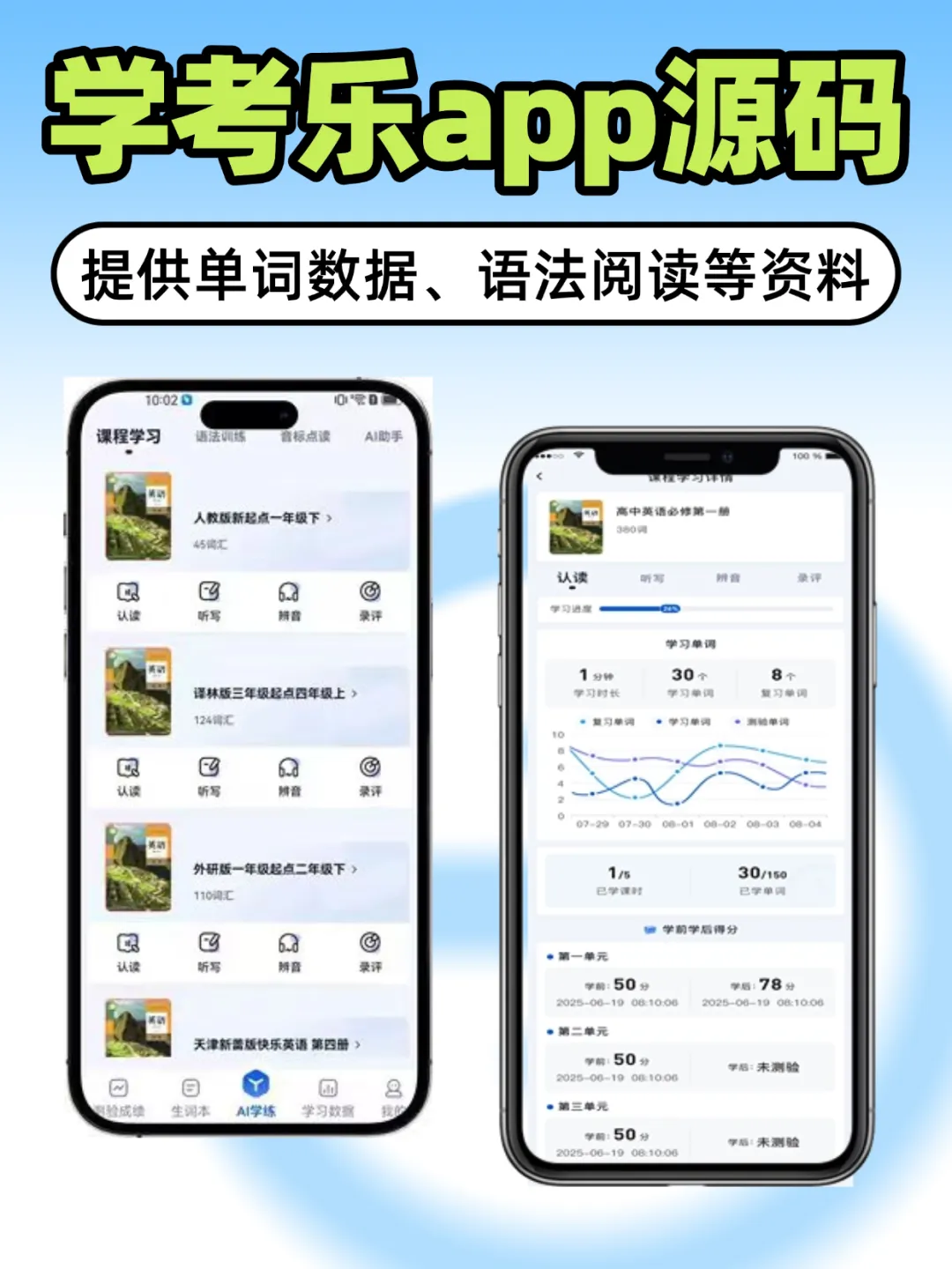 源码内置人教版、译林版等多版本教材词库,每个课程都配套认读、听写、测评、音标点读等功能,学员能直接跟着教材同步练,不用机构额外整理资源。