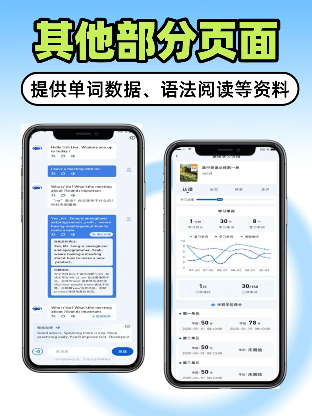 系统自动统计学员的学习时长、单词量、学情曲线、学前后得分变化,老师不用手动记录,能直观掌握每个学员的薄弱点,精准调整教学方案。