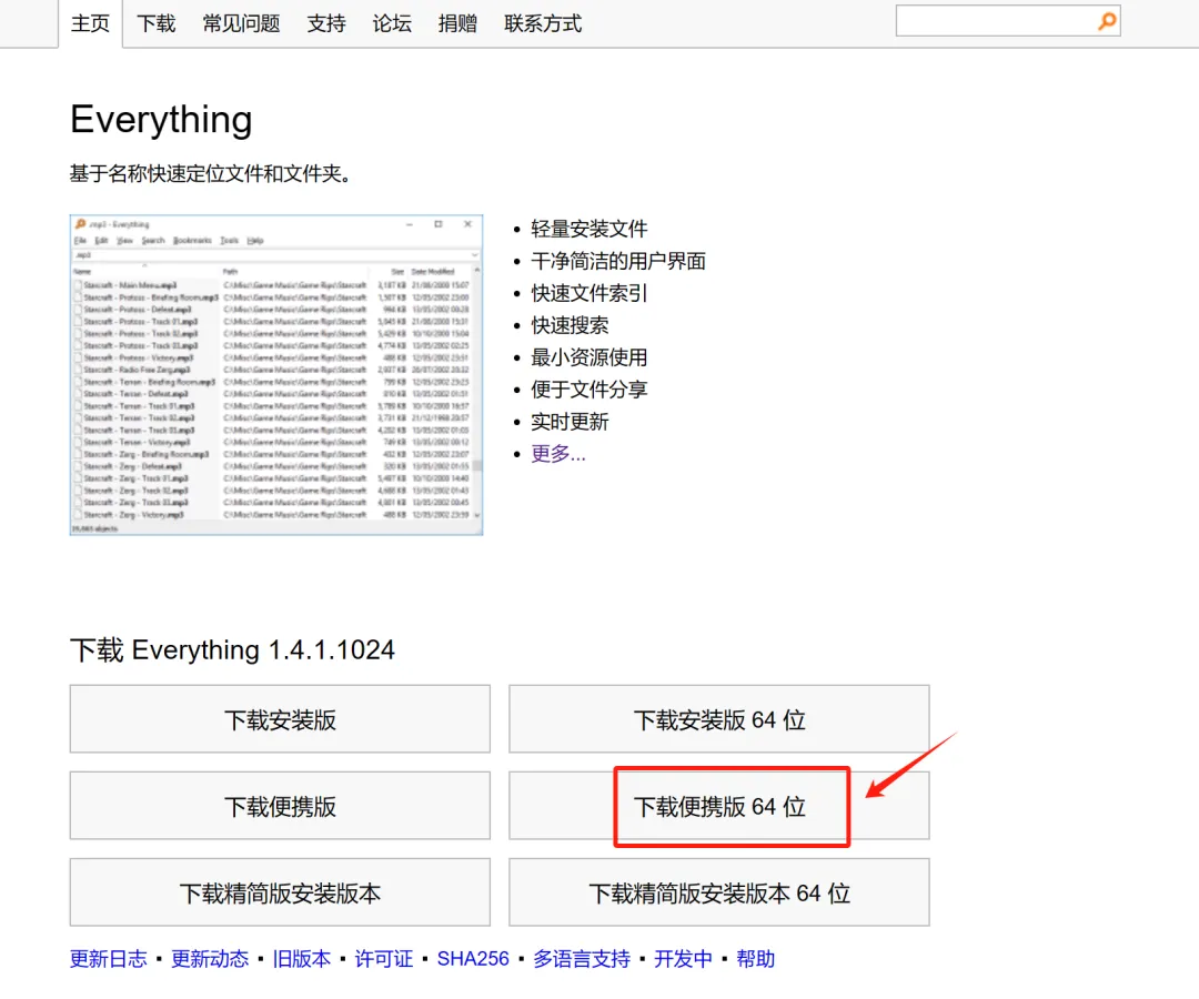 打开Everything官网(点击前往),选择合适的版本下载,推荐下载64位便携版。