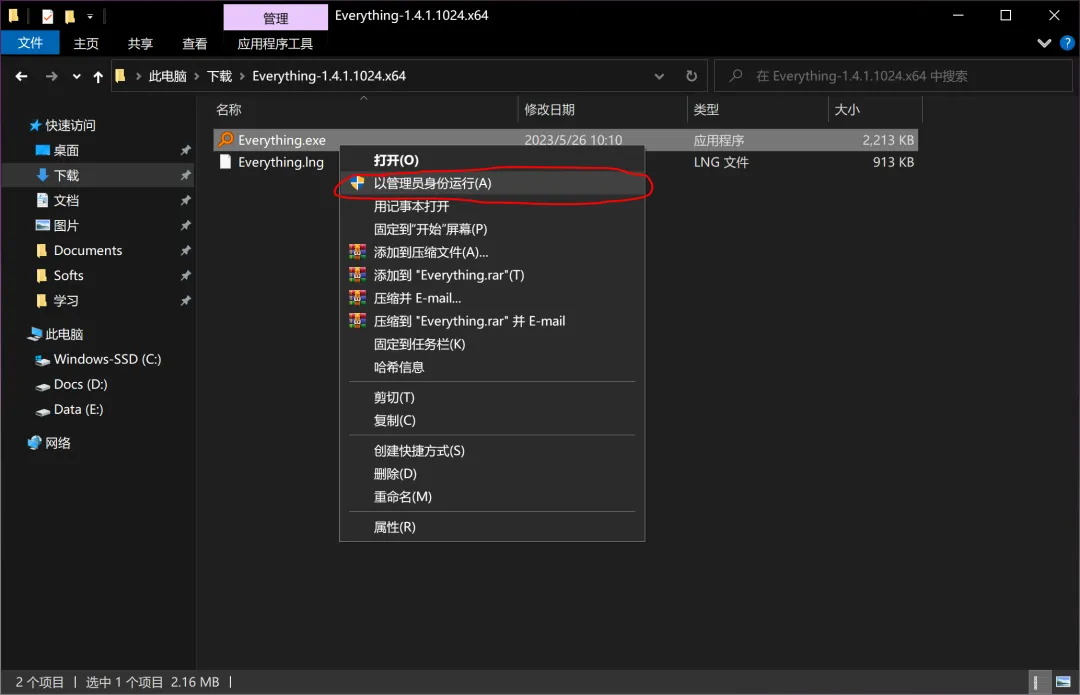 鼠标右击“Everything”文件,在弹出菜单中,用鼠标左击“以管理员身份运行”。