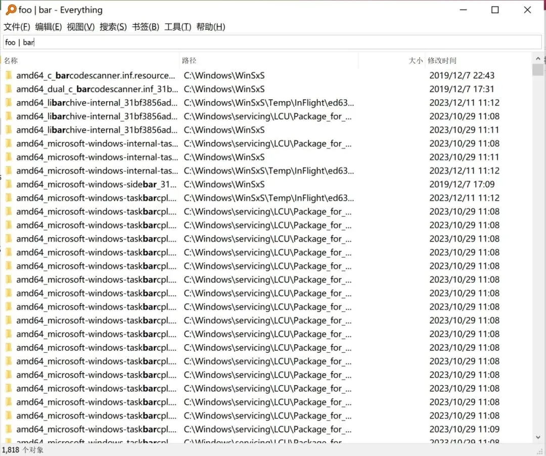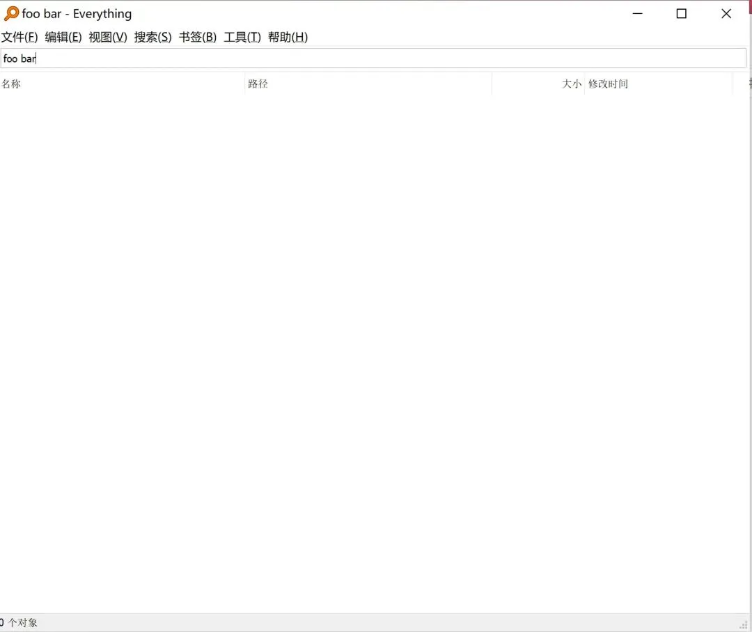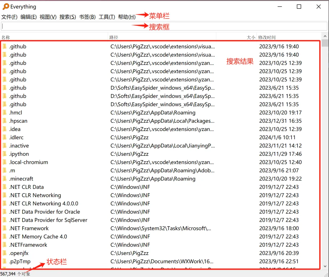 Everything软件界面由菜单栏、搜索框、搜索结果、状态栏构成。