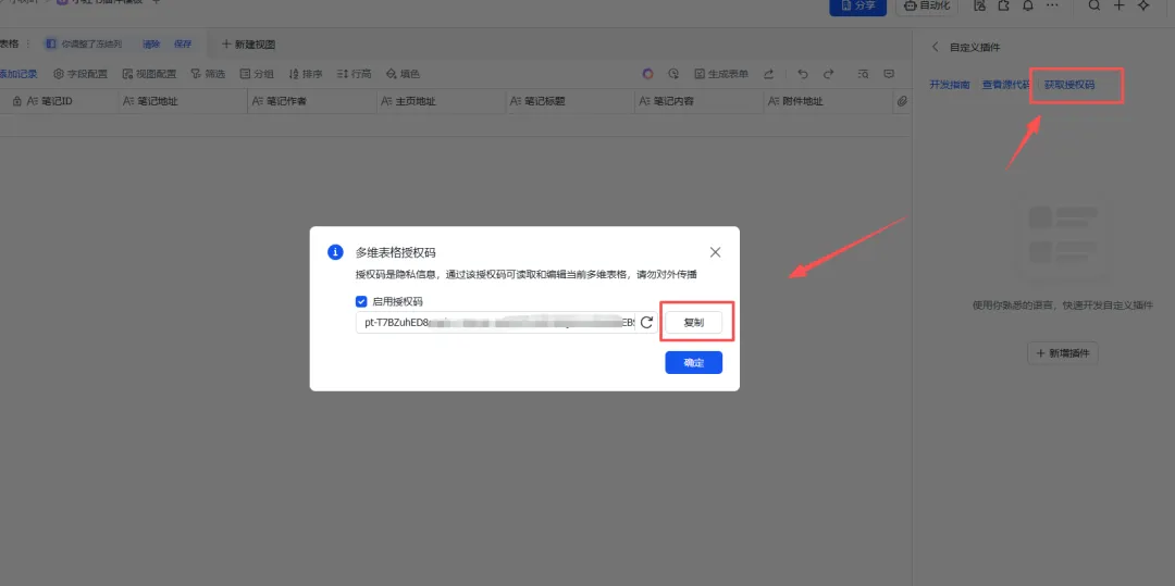 多维表格的授权码:点击绿色方框即可查看步骤,这里我直接截图,方便你直接操作哈。