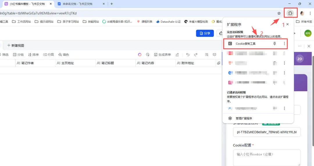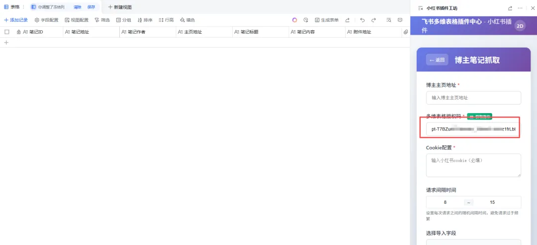 这里拿博主笔记抓取来举例: 你需要拿到多维表格的授权码和小红书的 Cookie,这个也简单。