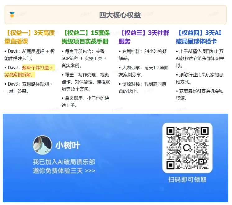 最后!想学 AI 却担心被割韭菜的小伙伴看过来! 我已经为大家争取到了「AI 社群破局俱乐部」精选的 四大核心权益,还有 3 天 AI 实战营!完全免费! 感兴趣的小伙伴们可扫码领取👇