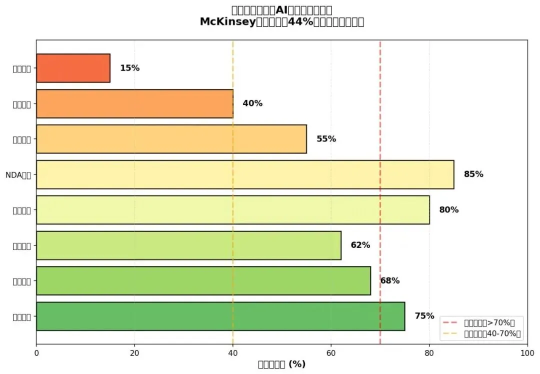图3:法律工作各环节AI自动化潜力评估(McKinsey研究:平均44%法律任务可自动化)