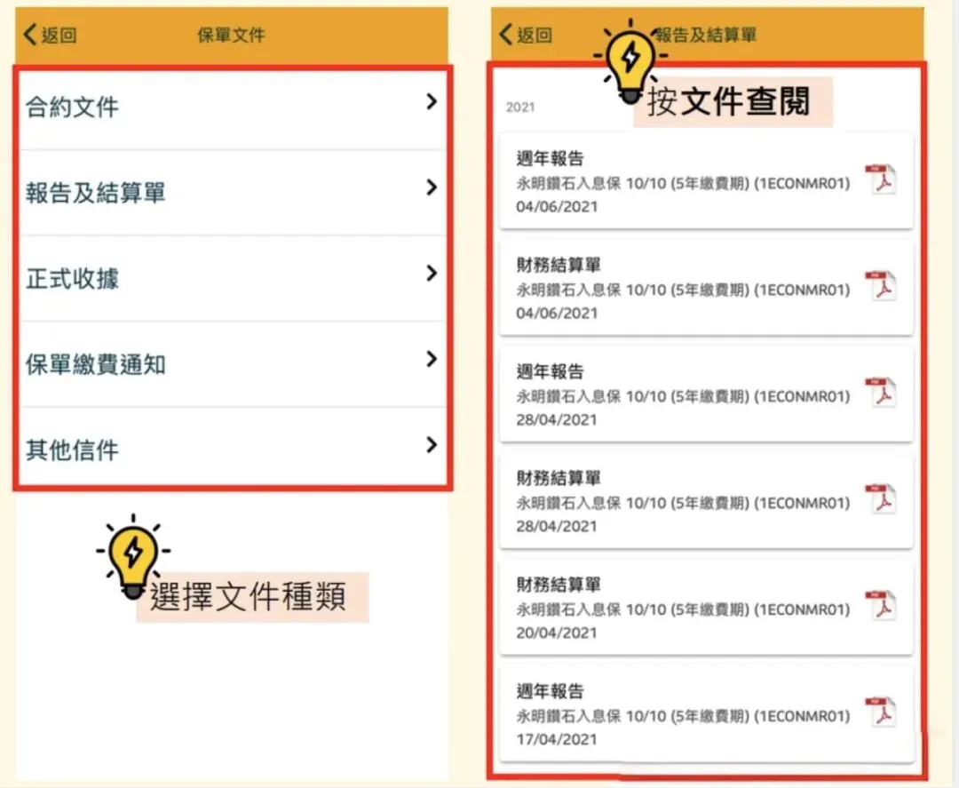 1️⃣ 首页点击【更多服务】2️⃣ 选择【保单文件】3️⃣ 选择文件类别(如合约文件、通知书等)4️⃣ 点击文件即可查看或下载