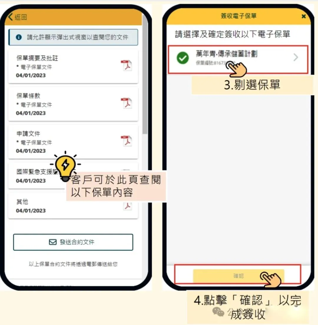 1️⃣ 进入【尚有待收之保单】2️⃣ 点击【产品名称】查看电子保单3️⃣ 勾选需要签收的文件4️⃣ 点击【确认】完成签收