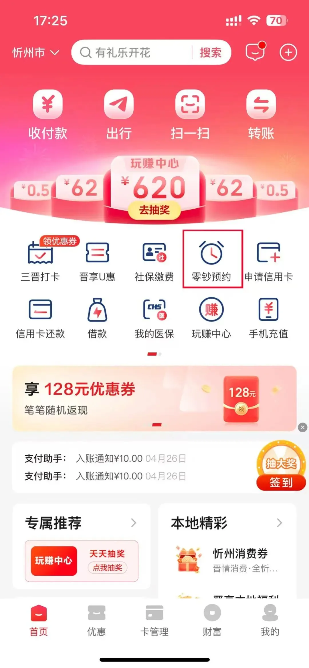 1、云闪付APP首页点击“零钞预约”