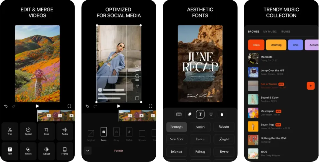 轻点几下就可以快速编辑混合视频,加速、裁剪、滤镜、音乐等,功能很全,可以将多个片段和实时视频合并为一部电影!