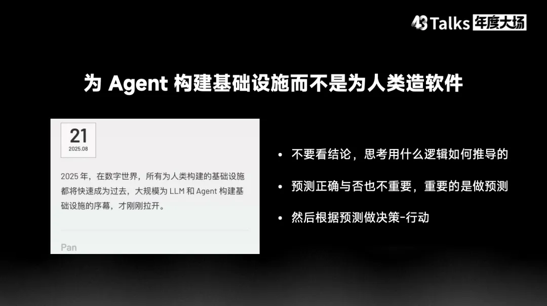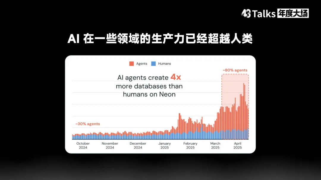 这种组织层面的协作瓶颈导致 AI 效能提升面临重大挑战。回顾软件发展历史,我们可以看到瀑布开发方法论和敏捷开发方法论在不同阶段的演进。在 AI 时代,我们尚未找到适合 AI 特点的软件工程方法论。停止为人类开发软件!为Agent造基建或许大家还未意识到的是,AI 在许多领域的生产力已经超越人类。以 Neon 云端数据库为例,2025年2月由 Agent 创建的数据库数量已经超过人类管理员创建的数量,这在云服务市场已经形成共识。2025年8月,我提出了一个颠覆性观点:从2025年开始,我们应当停止为人类开发软件。当前大量 Vibe Coding 产品仍然面向人类用户,但值得深思的是:当Agent 能够自主完成更多任务,包括直接访问数据库和调用接口时,我们是否还需要通过人类界面来实现这些功能?当前众多 UI Automation 工具确实令人印象深刻,RPA 的自动化能力也备受推崇。更值得深思的是:为什么让 Agent 去调用为人类设计的界面和基础设施?这种方式效率极其低下。Agent 应该直接访问所有数据和 API 接口。为 Agent 构建基础设施的巨大机会从另一个极端角度来找核心机遇。以移动互联网为例:全球 80 亿人口中,约 60 亿是移动互联网用户,每人每天使用 APP 的点击次数有限。在 AI 时代,如果每人拥有 100 个、1000 个 Agent,每个 Agent 每天调用接口和访问数据的频率将远超人类使用手机的频率。这一指数级增长的乘数效应将创造巨大的市场规模。2025 年的Claude Code 和 Manus 在做什么?持续提升大模型能力和为 AI 构建强大的中枢神经系统。Agent 能力在 2025 年取得了显著突破。那么在 2026 年 Token 消耗预期增长 100 倍的背景下,最大的发展机遇是为 AI 构建大规模的基础设施,包括完善的运行环境、API 接口和数据访问能力。AI Coding 的三个心得