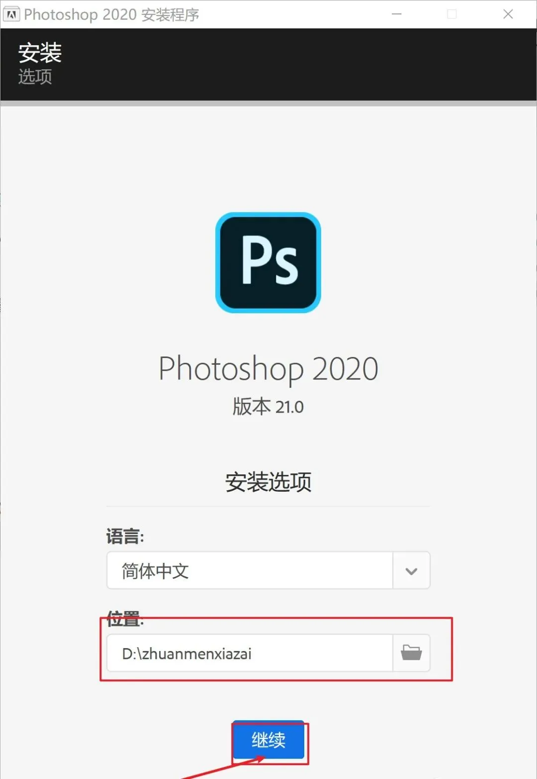 3.选择安装路径,默认是安装在C盘里,可以自行修改安装位置,但是要注意文件夹路径不要有中文 ,然后点击继续!