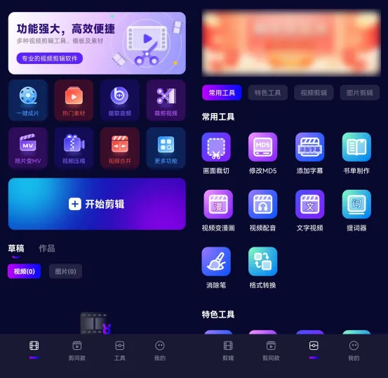这款软件提供了丰富的视频剪辑工具和特效,如裁剪、拼图、滤镜、文字、音乐等。