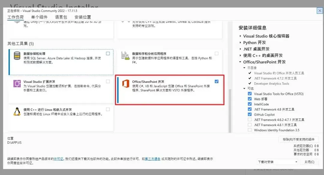 具体的安装教程这里不再赘述,网上有很多详细教程,但VSTO的开发,记得给下图红框内的工具勾上。