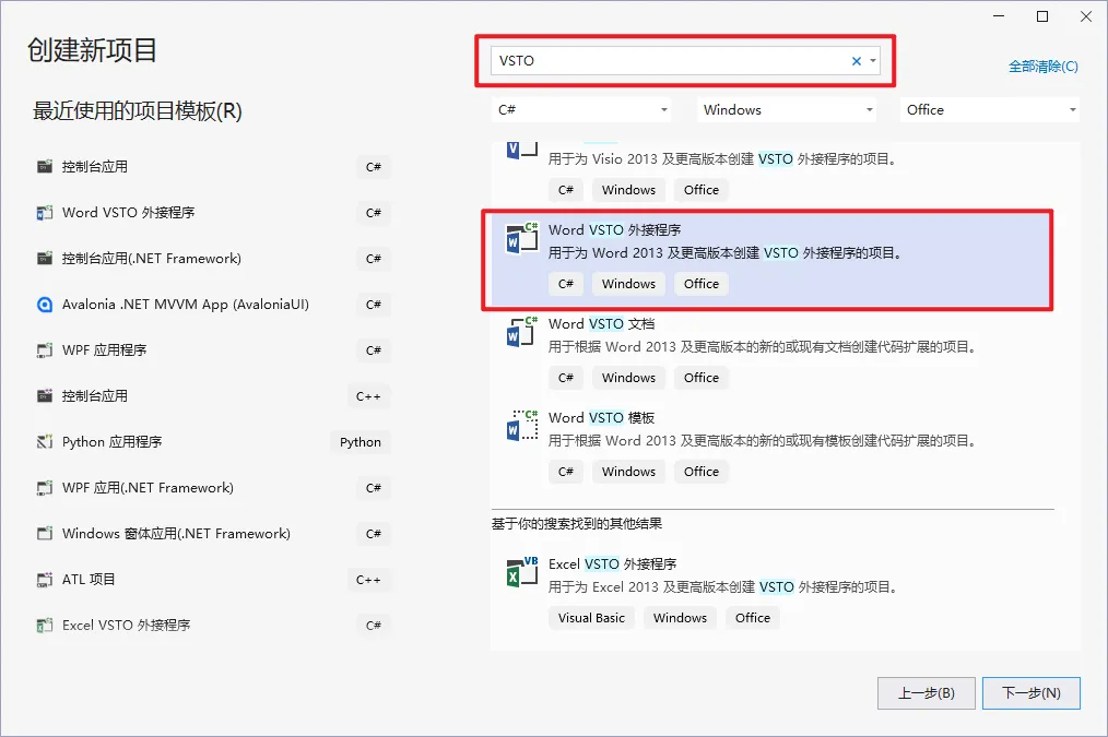 安装完毕后打开Visual Studio,创建新项目→搜索一下VSTO,就可以做对应的Word、Excel、PPT等软件的插件了,我以Word为例,选择Word VSTO外接程序,点击下一步,起一个项目名字,选择项目保存路径即可。