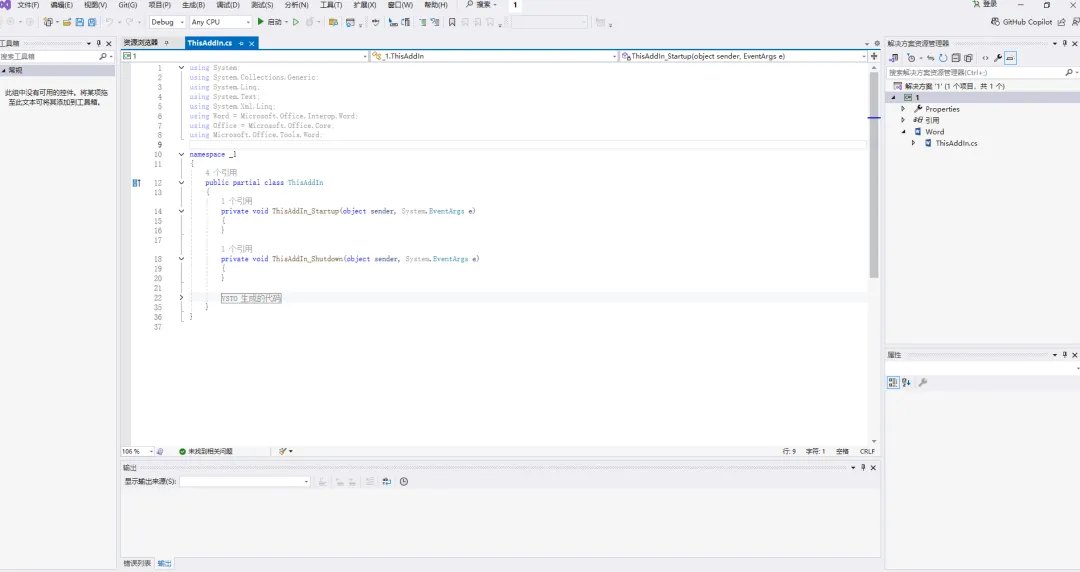 上述流程操作完,就真正进入到了VSTO的插件开发环节,打开是这样的: