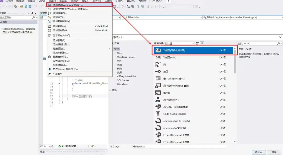在顶部点击项目→添加Windows窗体→功能区(可视化设计器)。